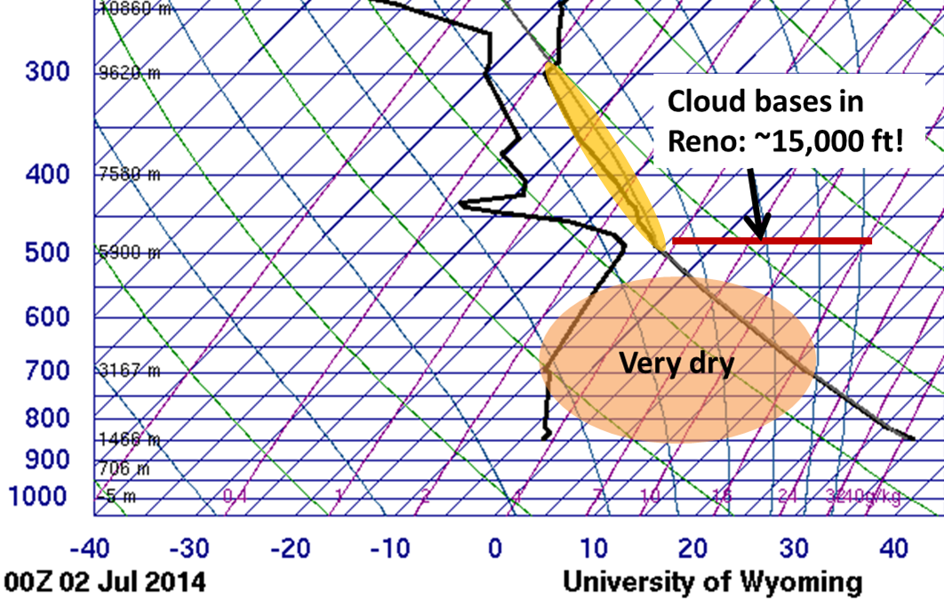 At the time of this sounding, it was 95 degrees with 8% relative humidity at the National Weather Service office. Notice the very dry air (shaded pink) in place between the very high cloud bases (red line) and the surface...this is often referred to as an inverted-V sounding due to its appearance. Another crucial factor is the weak instability (yellow shaded area) in the atmosphere for the formation of convective clouds. Many times in summer eastern California and western Nevada will see inverted-V soundings due to very dry lower level air and strong heating/atmospheric mixing. However, there is often little or no instability aloft for the formation of convective clouds (cumulus or thunderstorms).